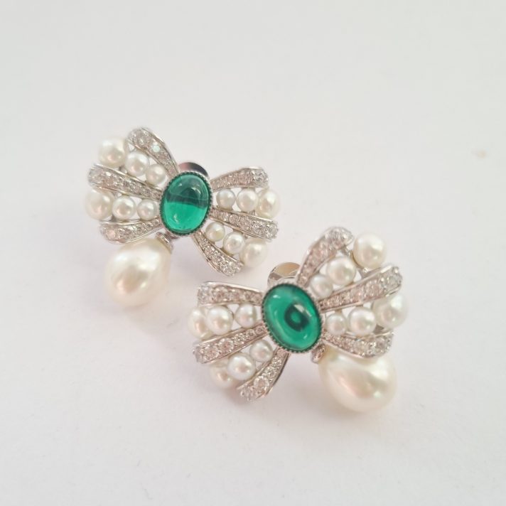 Charming bow and pearl earrings featuring a pretty sparkling cz and pearl bow with a cabochon cz emerald as the centre piece. The cz’s shimmer and sparkle and the hanging freshwater pearl adds a soft contrast.