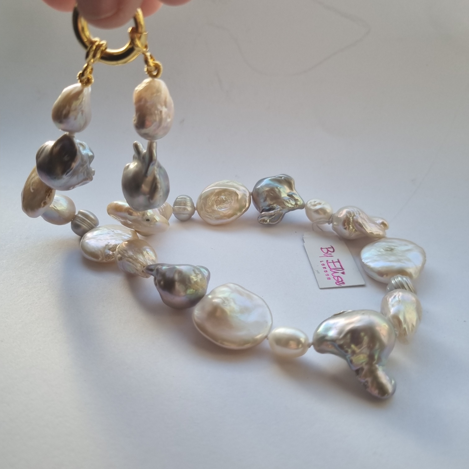 A unique baroque freshwater pearl necklace with penny pearls. This is a lovely blend of silver grey, white, pink, pale gold. It features the bolt ring clasp in vermeil which can be worn at the back of the neck or with a pendant at the front. This will add a statement worn inside the collar of a shirt or over a sweater.