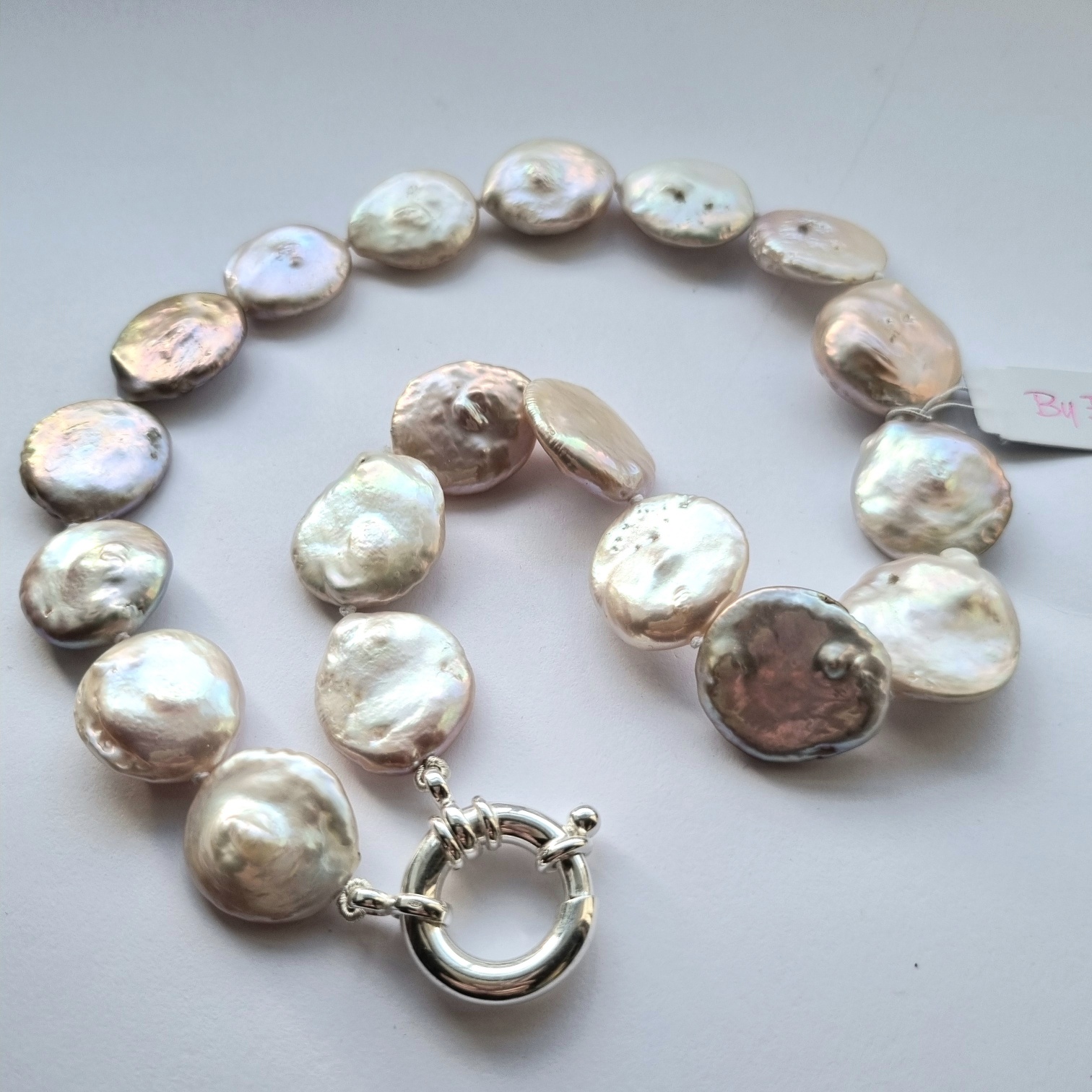 Gorgeous freshwater penny pearls in a very pretty range of shades from cream, pale pinks, purples to peach. With a lovely lustre these pearls are always popular as they sit so nicely around the neck. Modern and timeless they create a fluid rhythm. With the signature silver bolt ring clasp and shown with an Amethyst pendant which brings out the myriad of colours in the pearls.