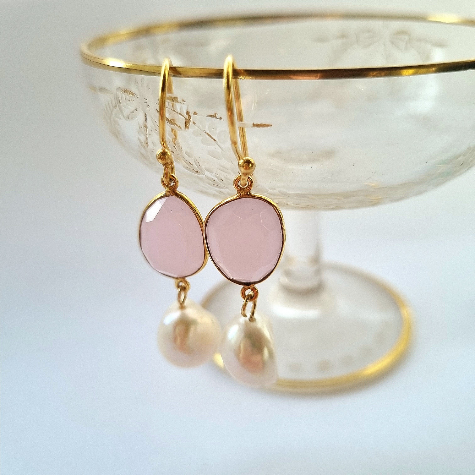 A lovely combination of a facetted vermeil Pink Hydro drop with a hanging freshwater pearl. This style is a classic earring of soft elegance with the organic pearls and the sparkle of the gemstone.