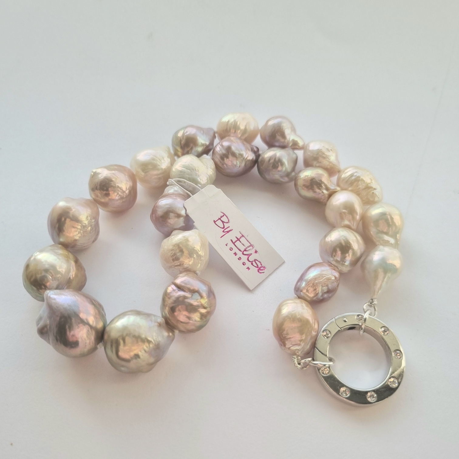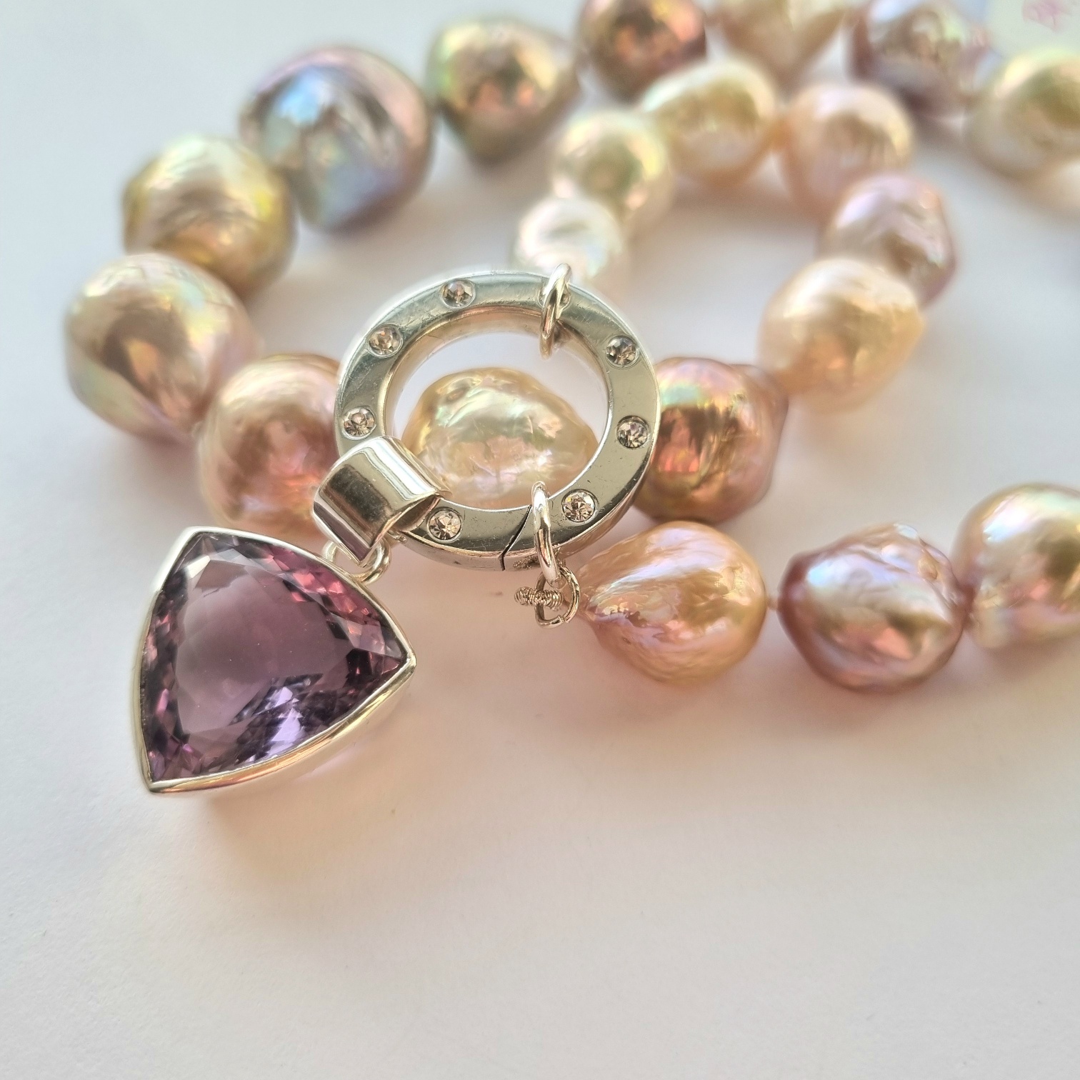 A stunnig pearl necklace that is a mix of baroque pearls of various colours creating a unique and elegant piece. The pearls are round and glow with a soft irredescence and have a classic timeless charm. The pearls are gradually graded. The clasp is silver with cz inset all the way round. The necklace can be worn as a classic necklace or with a pendant attached as in the photos.
