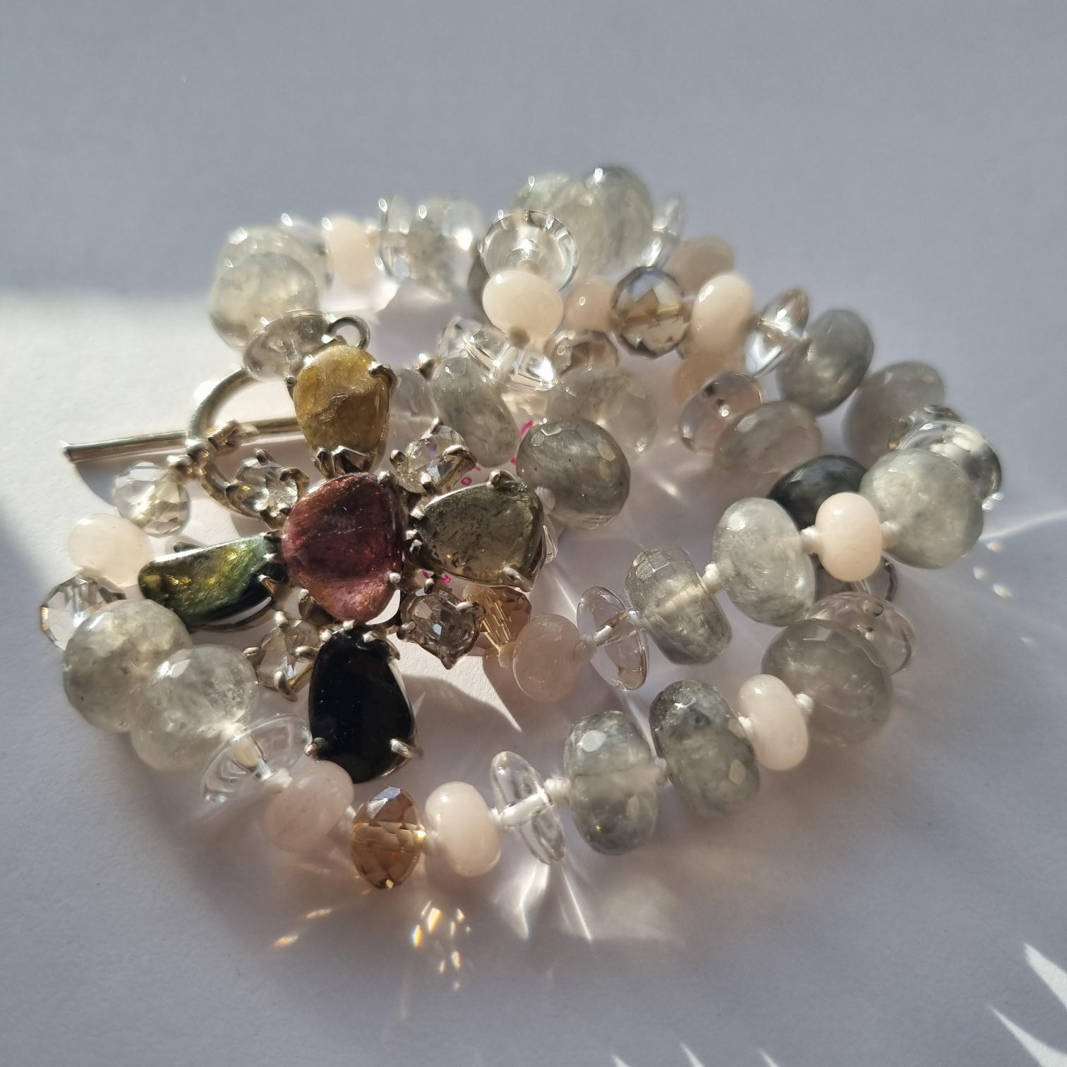A pretty necklace with a multi Tourmaline pendant at the centre with small crystals. The necklace is a mixure of Crystals in gentle greys, cream and irridescent white. The clasp is a silver T-bar.